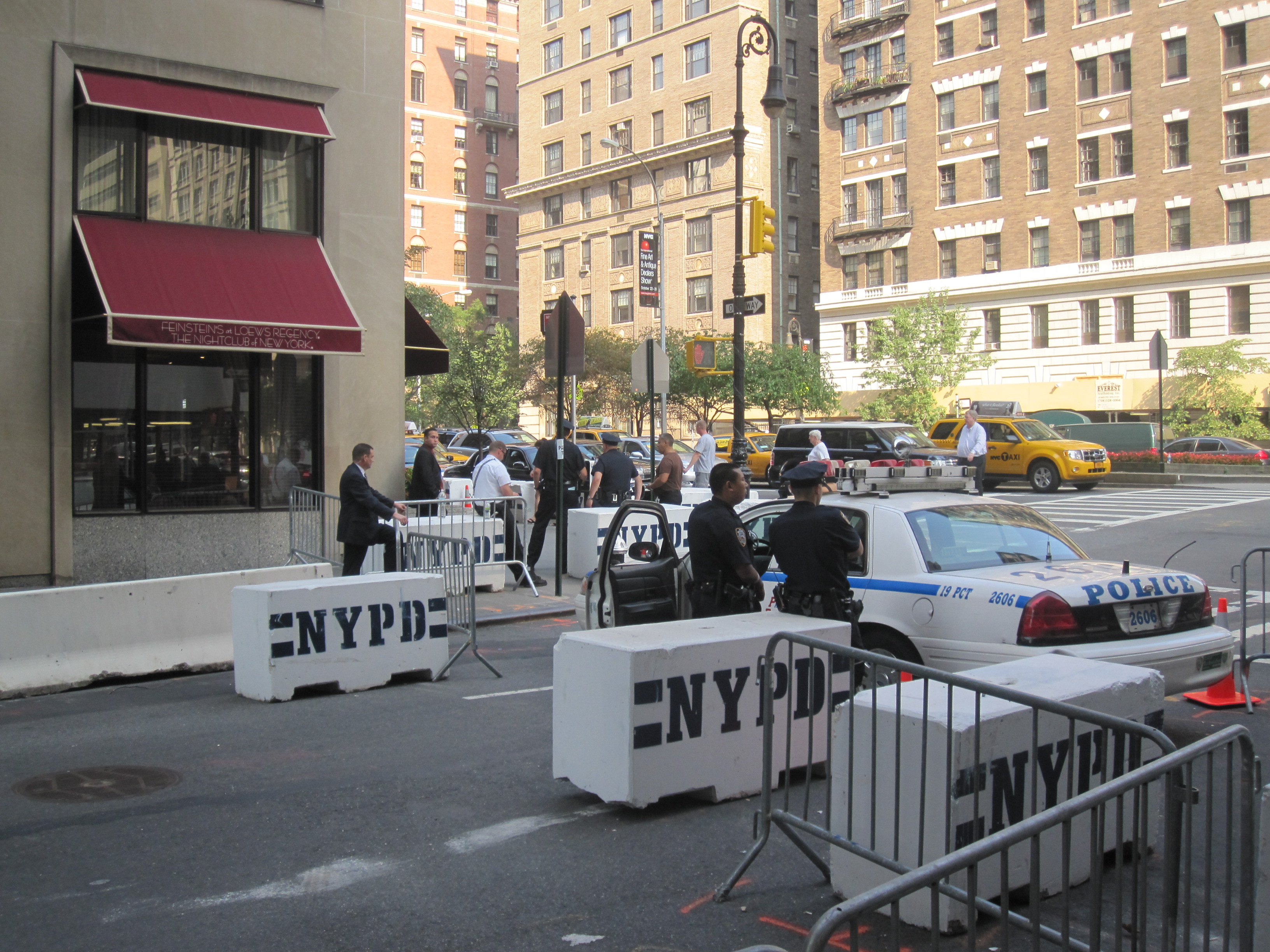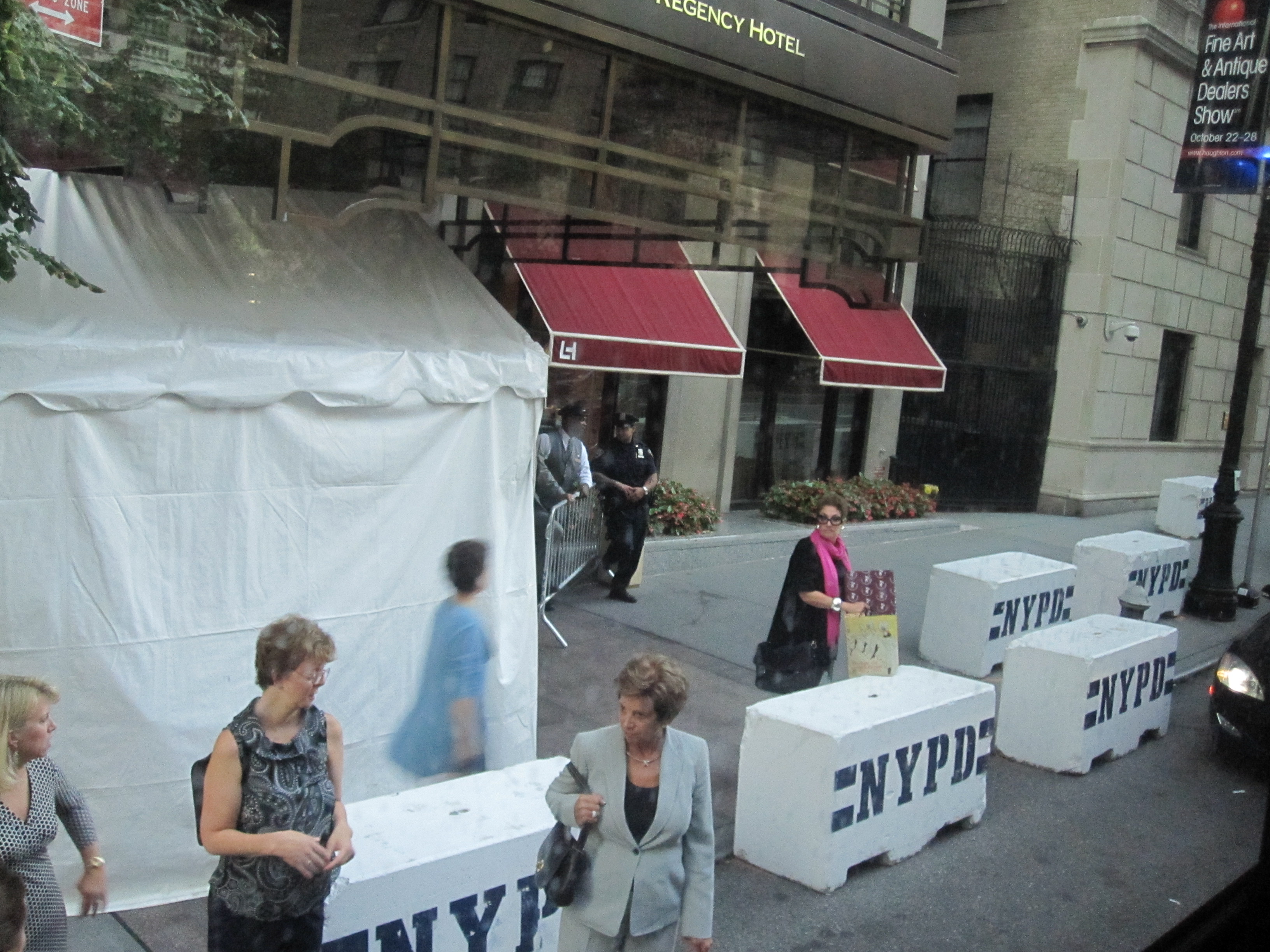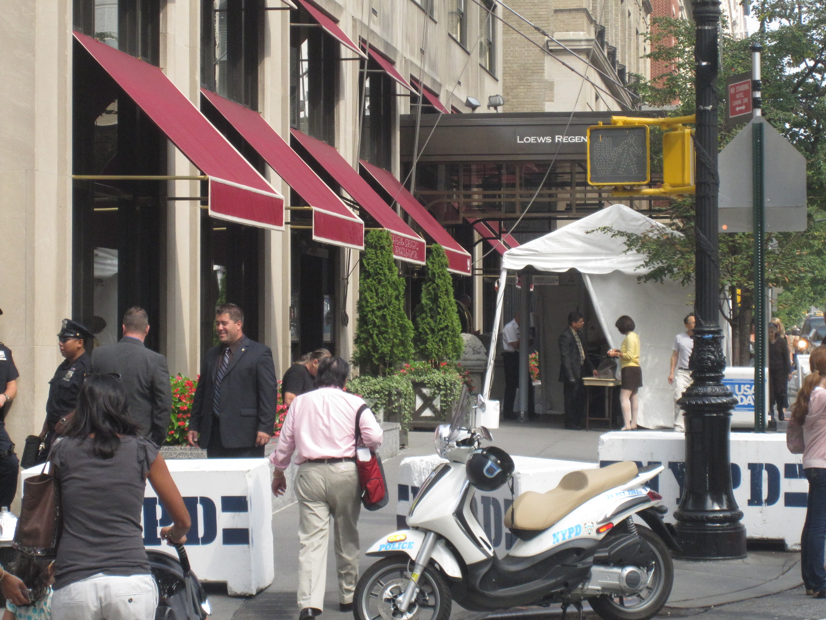 The UN General Assembly takes place every September in New York City since the headquarters are in the Big Apple. I was in Manhattan staying at the Loews Regency on Park for Katherine Heigl and Josh Duhamel’s new movie “Life As We Know It.” I’ve never seen so much security in my life… but it wasn’t for the celebs. Apparently several of the diplomats in town were staying at the hotel and it was HIGH SECURITY! There were no less than 9 officers when I entered the hotel. They set up a tent out front and screened all my luggage. I hd to go through a metal detector and get wanded just to get in. Once in the hotel, I was free to roam around but the lobby was flooded with Secret Service. They barricaded the streets and lined it with vehicles manned and full of ammunition — I felt like I was on a movie set. But it was all real! At least I didn’t get bed bugs!